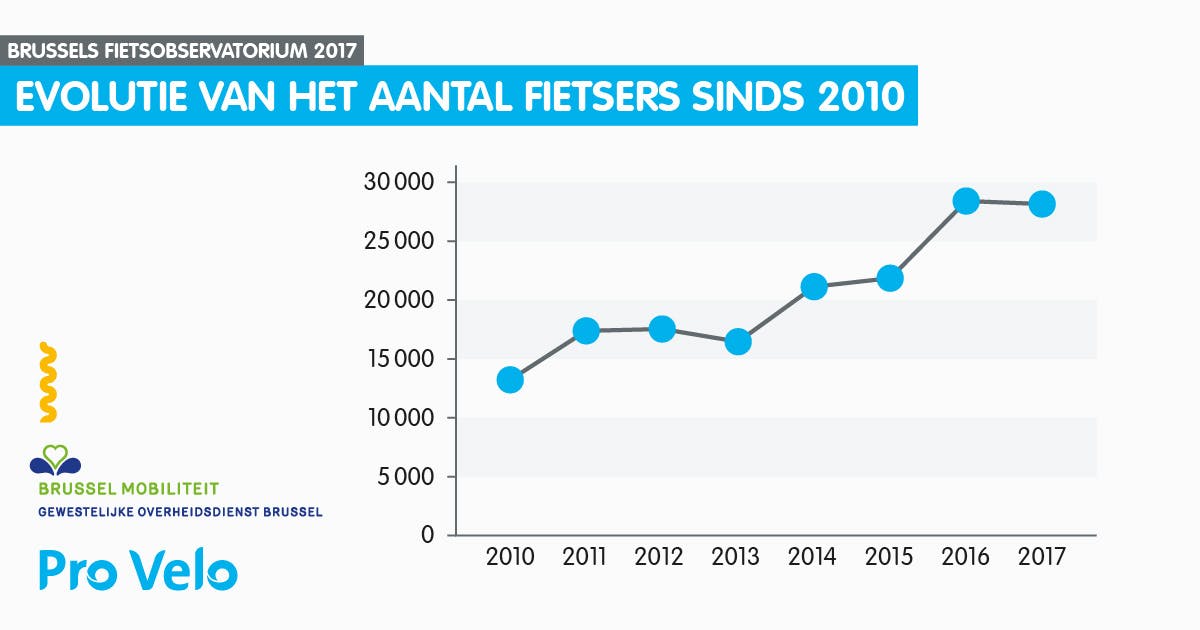 In vergelijking met 2016, stelden we in 2017 een stagnatie van het aantal fietsers in Brussel vast (-0,8%). 2016 werd evenwel getekend door een erg sterke stijging van het aantal fietsers (+30%). Deze werd onder andere toegeschreven aan de aanslagen op de metro, de sluiting van een aantal tunnels, de inrichting van de voetgangerszone in het centrum en aangenaam fietsweer. Omdat deze factoren in 2017 minder doorwegen op de Brusselse mobiliteitsgewoonten, zijn wij verheugd met dit globale resultaat. Meer in het bijzonder zien we graag bevestigd dat Brussel ook tijdens winterweer steeds vaker per fiets wordt doorkruist.